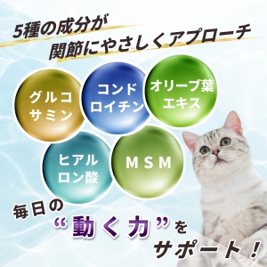 フラボノイドなどの優れた栄養素が含まれるプロポリスや、軟骨再生に必要なグルコサミンとコンドロイチンなどの働きで関節の健康を維持し、愛猫が毎日アクティブな生活を過ごせるようにサポートします。