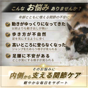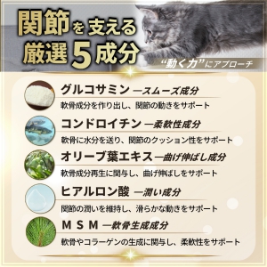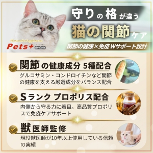 フラボノイドなどの優れた栄養素が含まれるプロポリスや、軟骨再生に必要なグルコサミンとコンドロイチンなどの働きで関節の健康を維持し、愛猫が毎日アクティブな生活を過ごせるようにサポートします。